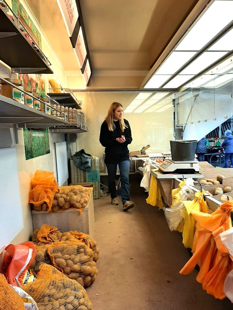 Die Verkaufsrückwand ist bei den Bellingröhrs nicht mit den üblichen Unterschränken und Arbeitsflächen ausgestattet, sondern überlässt den Raum der Vorratsware an Kartoffeln, die somit sehr schnell und einfach ins Fahrzeug geladen und in die Verkaufstheke nachgefüllt werden kann.
