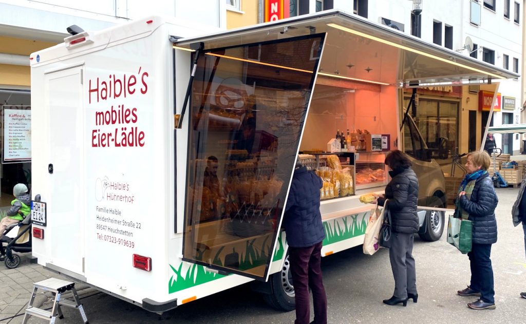 Doch nicht nur im Allgäu begeistert "Haible's mobiles Eier-Lädle". Auch mittwochs und samstags ist es auf dem Wochenmarkt in Heidenheim anzutreffen.