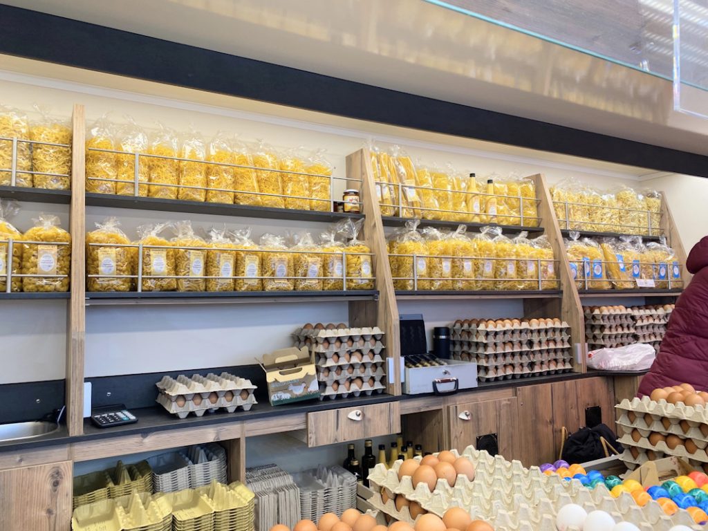 Der Verkaufswagen ist ideal ausgestattet für den Verkauf von Eiern und Eierprodukten wie Nudeln, Spätzle oder Eierlikör. Aber auch Honig, Suppeneinlagen und frisches Geflügel gehören zum Portfolio. All dies wird ansprechend und übersichtlich in einem großen Warenregal an der Rückwand, sowie einer Verkaufstheke mit Selbstbedienungsabteil und einer kleinen Multitop-Kühltheke präsentiert. Damit das Fahrzeug von allen gesehen wird, ist es sowohl im Verkaufsraum, als unter der Verkaufsklappe mit lichtstarker LED-Beleuchtung in Produktfarbenlicht ausgestattet.