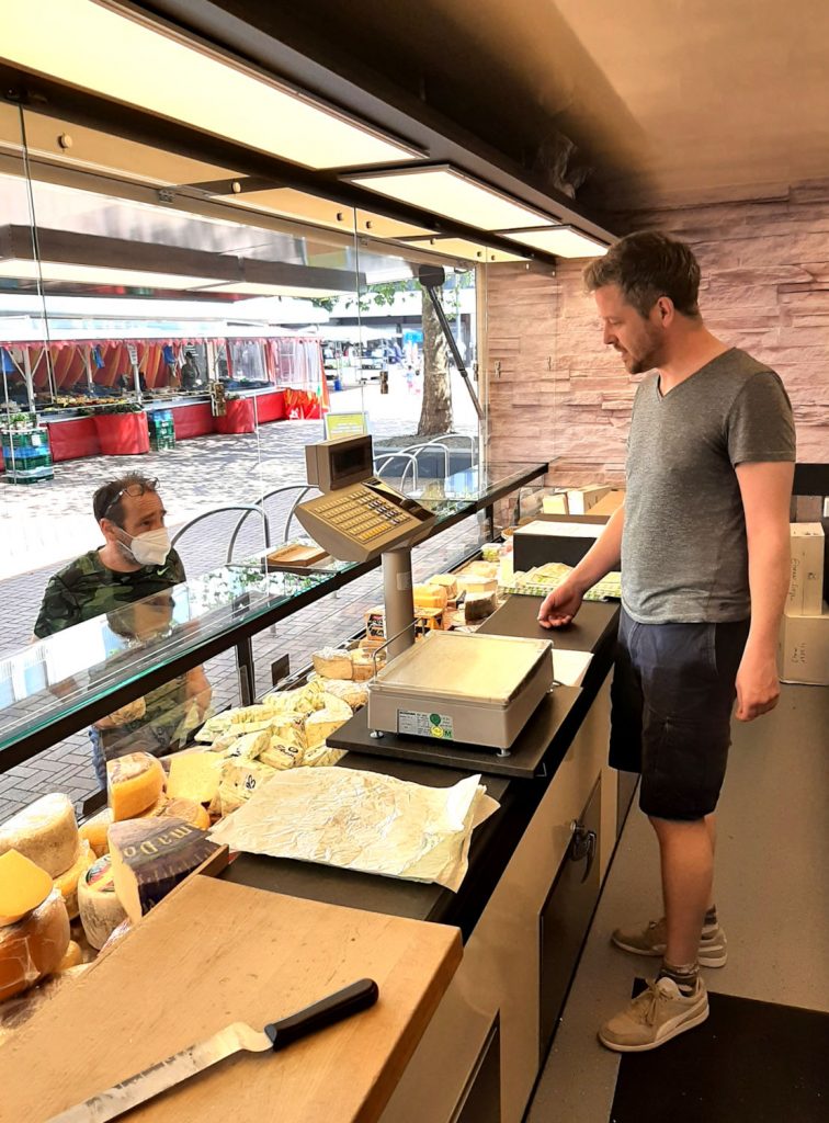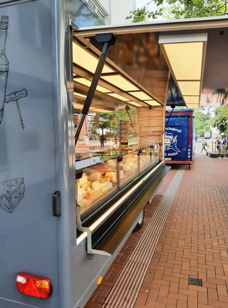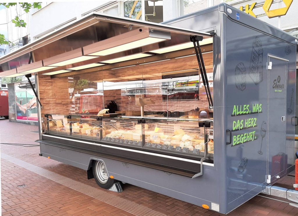 Simon Ebener aus Siegen bietet frischen Bergkäse aus Österreich, der Schweiz und zahlreiche weitere europäische Schnitt- und Weichkäsesorten an. Als Unternehmer, der das Geschäft im Jahr 2010 übernommen hat, präsentiert er seine hochwertigen Produkte auf den Wochenmärkten in Kreuztal, Siegen und Hilchenbach. Besonders für Feinschmecker hat er exklusive Lieferverträge für verschiedene Schweizer Bergkäsesorten abgeschlossen. Simon Ebener führt das Familienunternehmen bereits in dritter Generation und hat im Jahr 2021 seine Verkaufswagenflotte um einen beeindruckenden 5,40 m langen FISCHER Anhänger mit Multitop-Kühltheke und absenkbarem Fahrgestell erweitert. So kann er seinen Kunden die Ware "auf Augenhöhe" präsentieren und das Kauferlebnis noch intensiver gestalten. Auch das ansprechende Design dieses Fahrzeugs trägt zum Verkaufserfolg bei, mit einer modernen Rückwand in Steinoptik, schwarzen Werbetafeln und Effekt-Beleuchtung als Highlight. Wir von FISCHER sind stolz darauf, dass wir zusammen mit Simon Ebener dieses neue und individuelle Verkaufsfahrzeug realisieren durften. Mit diesem einzigartigen Design kommt der leckere Käse besonders gut zur Geltung!