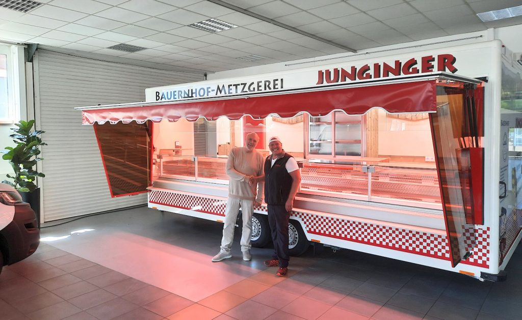 Bereits im Frühjahr 2025 durften wir den dritten Verkaufsanhänger an die Metzgerei Junginger aus dem schwäbischen Holzheim übergeben. Mit dieser Verkaufswagen-Flotte beliefert das Unternehmen insgesamt 14 Wochenmärkte im Raum Ulm. Das kommt nicht von ungefähr: Die schwäbischen Fleisch- und Wurstspezialitäten aus eigener Herstellung erfreuen sich großer Beliebtheit bei den Kunden.
