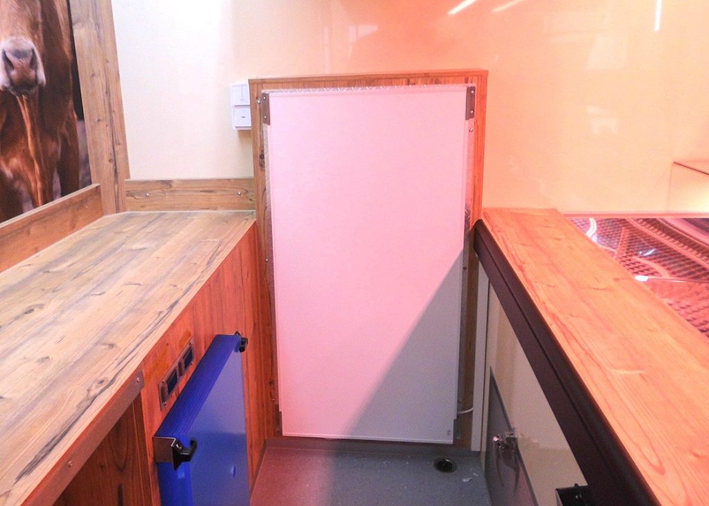 Der neue FISCHER-Verkaufswagen ist mit einer 6 Meter langen Multitop-Kühltheke ausgestattet, die inklusive gekühltem Unterbau viel Platz für Vorratsware bietet. Im zentral positionierten Sichtkühlschrank an der Rückwand können weitere Produkte attraktiv präsentiert werden – inklusive stimmungsvoller Beleuchtung. Eine beleuchtete Werbetafel sowie ein Motivbild machen auf das Angebot aufmerksam. Besonders auffällig ist der Schriftzug der Metzgerei Junginger in der Lichtblende, die in den Unternehmensfarben gestaltet ist. Die charakteristische Außenfolierung der Metzgerei sorgt für einen hohen Wiedererkennungswert – so ist das Fahrzeug auch von hinten oder im geschlossenen Zustand kaum zu übersehen.
