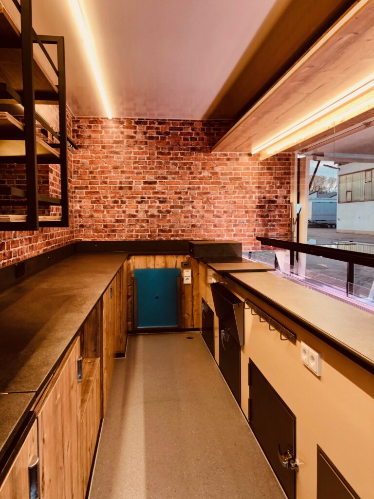 Wir verwenden nur Leichtbau-Tischlerplatten, die Feuchtigkeit und der täglichen Beanspruchung durch schwere Waren und Reinigung über viele Jahre hinweg standhalten. Auch der Aufbau besteht aus selbst hergestellten, robusten und dennoch leichten Sandwichelementen. Das Ergebnis: hohe Zuladung, einteilige Verkaufsklappen ohne Zwischenpfosten und tragfähige Wände, an die Sie auch schwere Waren hängen können.
