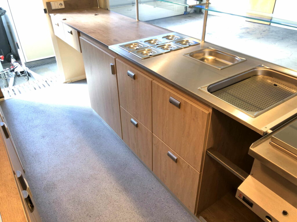 Fett und Gewürze der Waren legen sich mit dem Dampf auf den Oberflächen im Fahrzeug ab und müssen sich möglichst einfach entfernen lassen. FISCHER bietet Ihnen dafür Verkleidungen aus Edelstahl für Wand, Decken und Arbeitsflächen, zum Schutz vor Hitze, Fett und Feuchtigkeit.